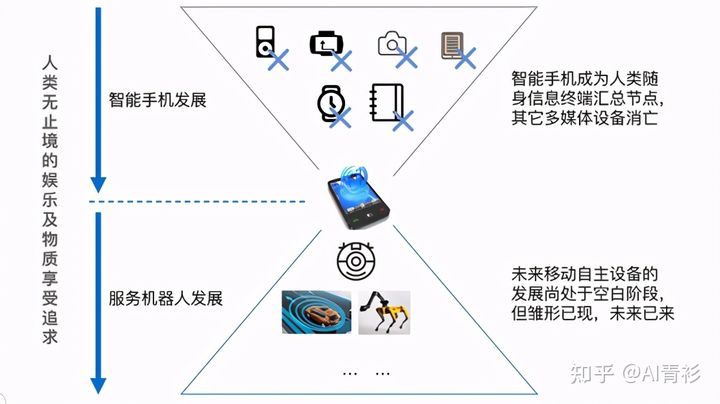 形象描述一下规模,今天全球大约有70亿人口,在PC时代,差不多20亿个人电脑接入网络;进入移动时代,差不多100亿手持设备,与PC时代至少形成5倍的代差;而未来,充斥人类社会的将是无处不在的机器智能体——自动驾驶汽车、联网的冰箱、电视、洗衣机、音响、以及数量无穷的服务型机器人——在移动机器人时代,500亿移动智能设备已经可以期待——而人类,只要能创(lan)新(duo),就一定会更创(lan)新(duo),所以这一切都是必然会发生的。